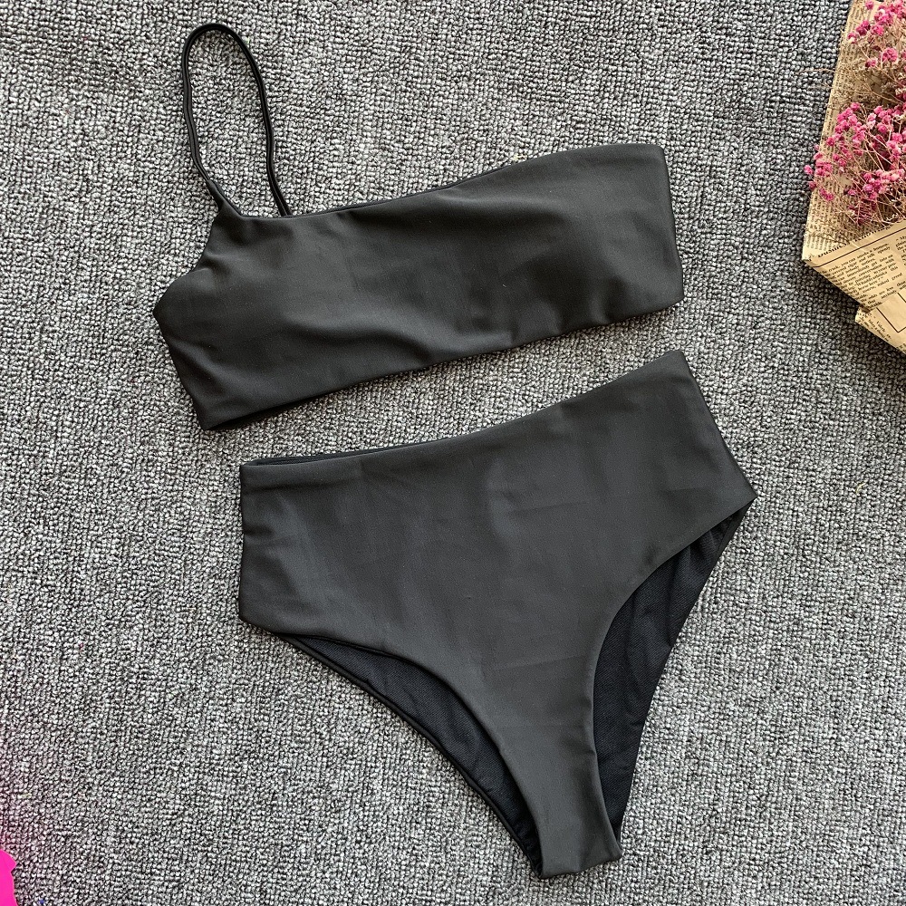 High Waist Solid Color Bikini - Women's One Shoulder Set
